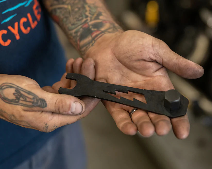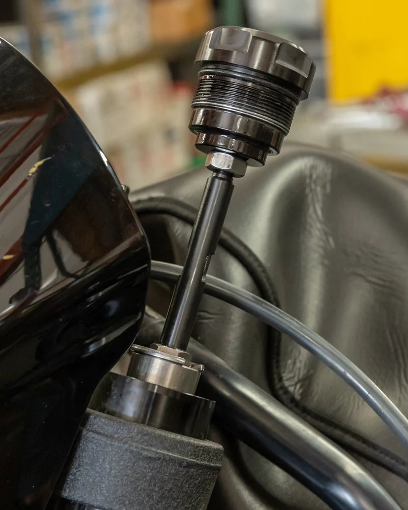 Softail low rider S inverted front end lift kit. These will actually lift the front end 2”. Very easy to install just jack up your bike until weight is off front tire. Crack the top hex top cap loose with supplied tool on both sides. Lower bike so top adjuster comes up take top cap loose from lock nut install extension with supplied locknuts and Jack bike up to screw top cap back in and all done! We also install all this in house too! Just call the shop 951-674-3428 and schedule an appointment.