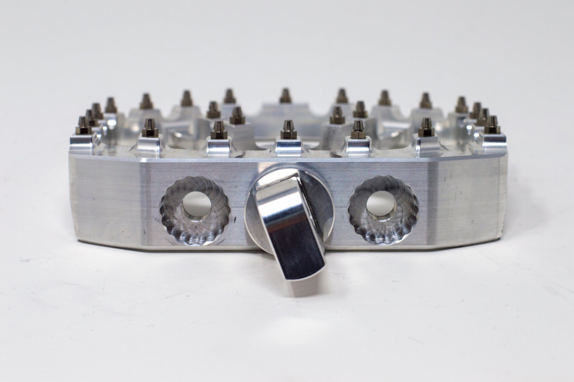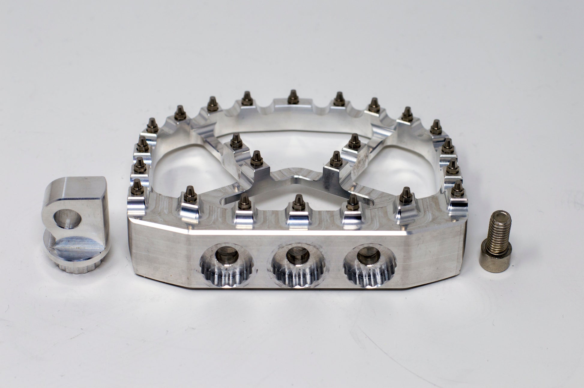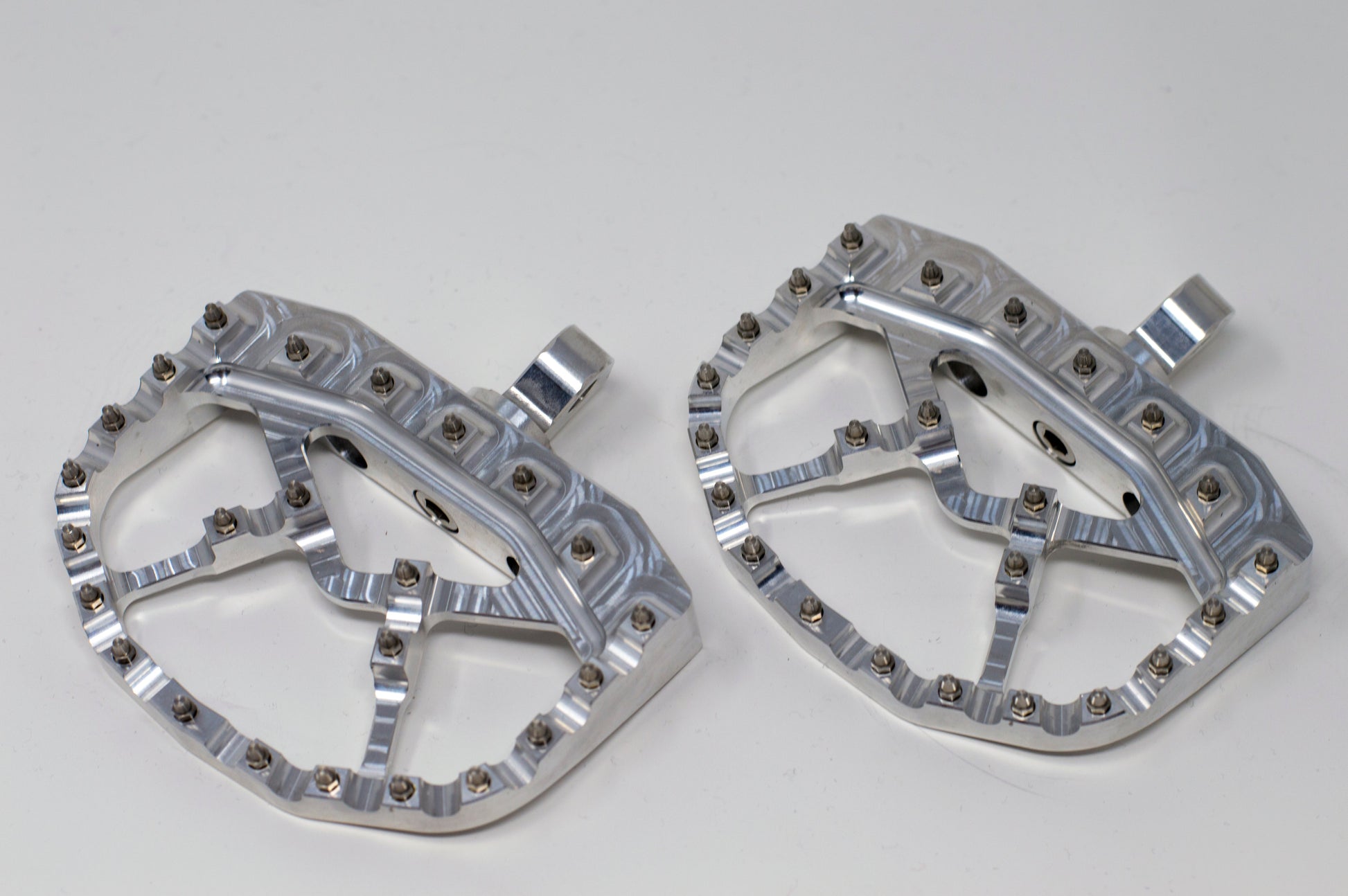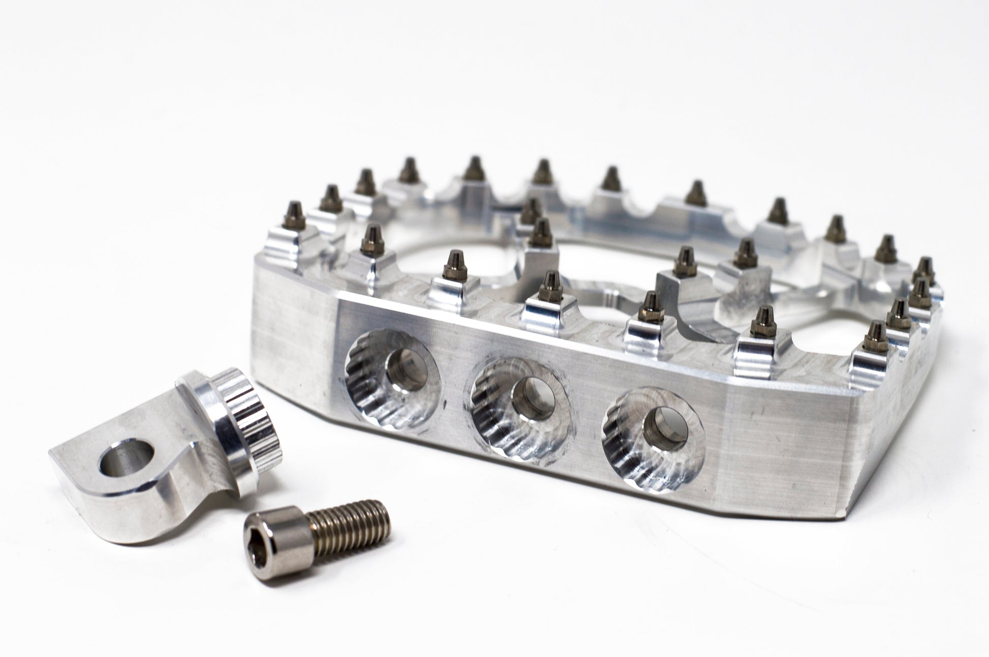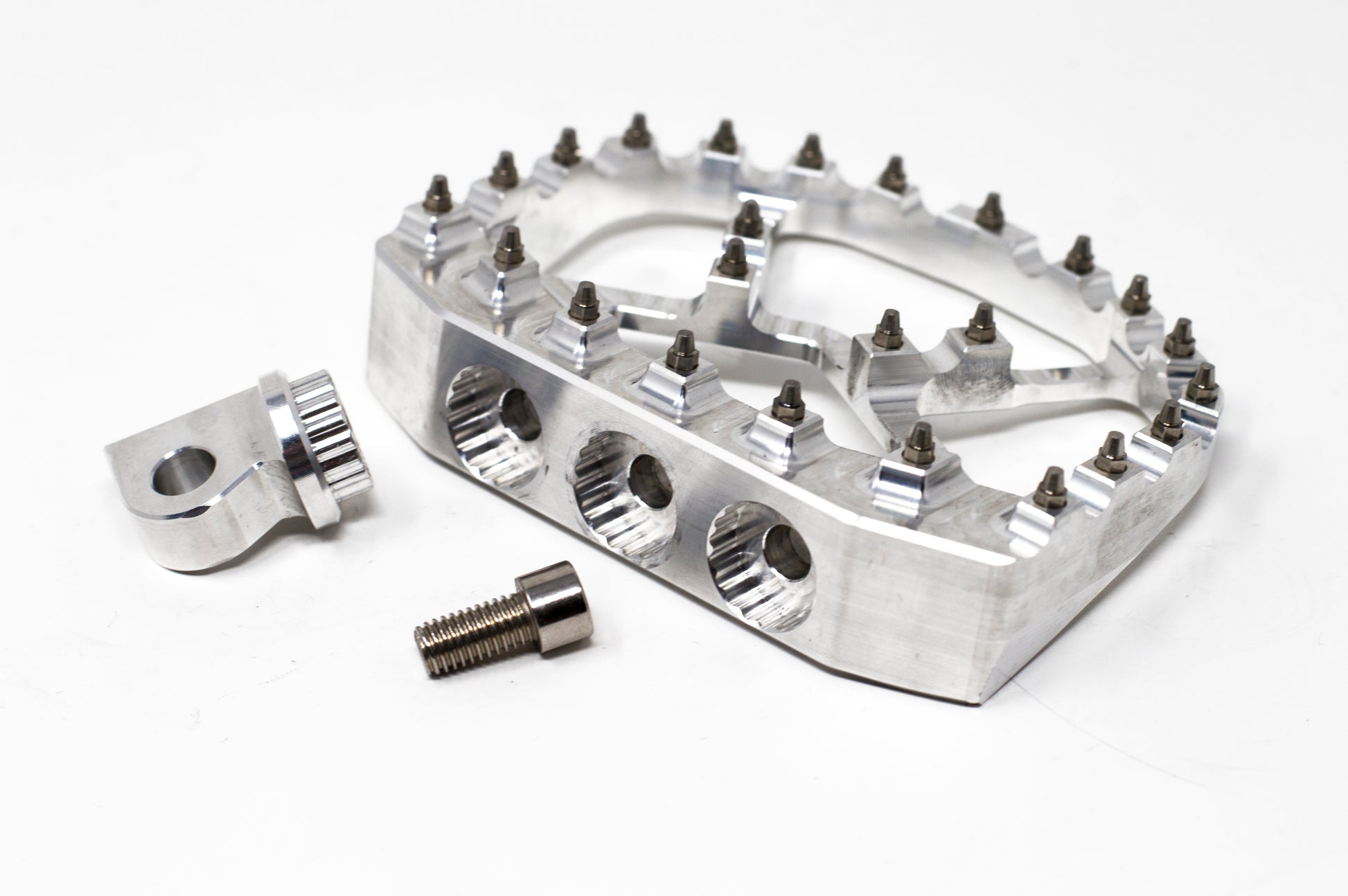 Our MX Mini Floorboards are made from 6061 T6 alloy aluminum by CNC machining. These materials are up to 50% Lighter than most stock foot pegs. Color anodizing surface treatment helps improve the corrosion resistance and gives a badass custom look. Full 360 degree foot peg rotation makes these foot pegs perfect for whatever riding style you prefer. The comfortable serrated surface area gives you a wider area for your feet and provides a good bite on the bottom of your shoe. All fasteners are made from stainless steel for wear-resisting and resisting corrosion. These new Mini Floorboards measure in 4.75 inch x 3.5 inch.