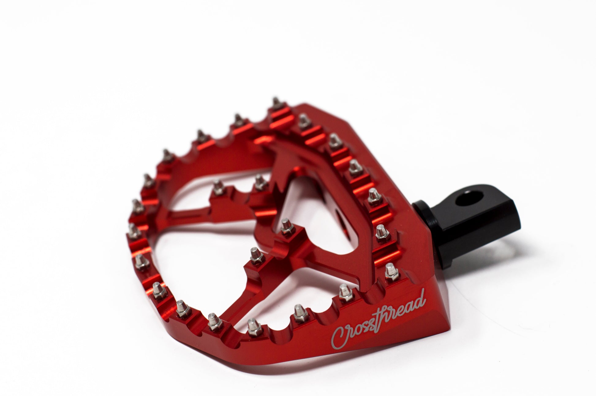 Our MX Mini Floorboards are made from 6061 T6 alloy aluminum by CNC machining. These materials are up to 50% Lighter than most stock foot pegs. Color anodizing surface treatment helps improve the corrosion resistance and gives a badass custom look. Full 360 degree foot peg rotation makes these foot pegs perfect for whatever riding style you prefer. The comfortable serrated surface area gives you a wider area for your feet and provides a good bite on the bottom of your shoe. All fasteners are made from stainless steel for wear-resisting and resisting corrosion. These new Mini Floorboards measure in 4.75 inch x 3.5 inch.